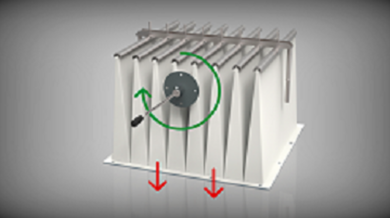 The creases on the cartridge filter are gently hit by the manually-moving brushes. This effectively removes coarse and granulated dusts from the filter. The brush carrier axis turns in the middle of the cartridge (raw-gas side) in two directions.