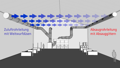 ESTA has developed two different processes for hall air extraction- Push Pull mixed ventilation and Upstream layered ventilation. In both cases, a central extraction unit is used, e.g. the ESTA DUSTMAC installation. It is installed in the interior of the hall or outdoors and is connected with an extraction and feed air pipeline.